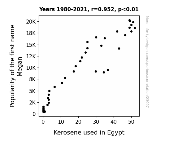 This means 90.5% of the change in the one variable (i.e., Kerosene used in Egypt) is predictable based on the change in the other (i.e., Popularity of the first name Megan) over the 42 years from 1980 through 2021.