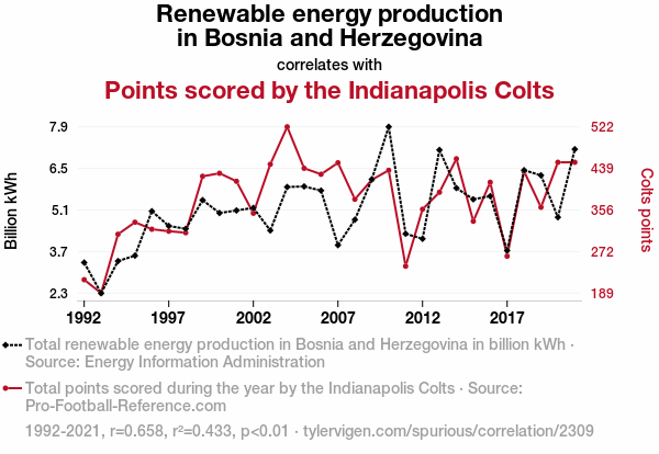 This means 43.3% of the change in the one variable (i.e., Points scored by the Indianapolis Colts) is predictable based on the change in the other (i.e., Renewable energy production in Bosnia and Herzegovina) over the 30 years from 1992 through 2021.