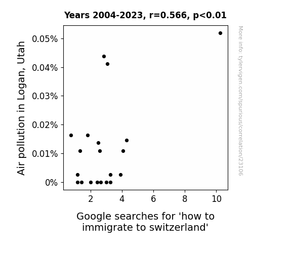 This means 32.1% of the change in the one variable (i.e., Google searches for 'how to immigrate to switzerland') is predictable based on the change in the other (i.e., Air pollution in Logan, Utah) over the 20 years from 2004 through 2023.