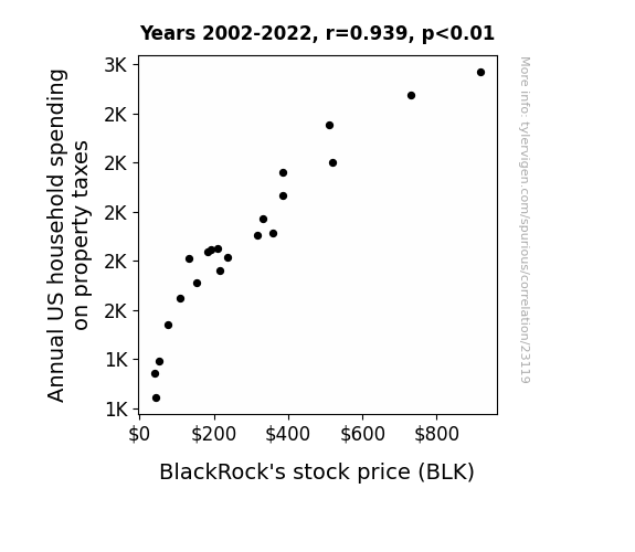 This means 88.2% of the change in the one variable (i.e., BlackRock's stock price (BLK)) is predictable based on the change in the other (i.e., Annual US household spending on property taxes) over the 21 years from 2002 through 2022.