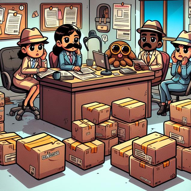 Prompt: [ Cute cartoon ] Create an image of a cozy office in Delaware filled with adorable private detectives absorbed in solving mysteries. Surround the room with stacks of Amazon packages, portraying the ever-growing shipping revenue in millions of dollars. The detectives are working diligently, the scene conveying a subtle connection between their work and the symbol of the Amazon packages. The depiction should include only scenes, people, and objects, it should not include text or speech bubbles.