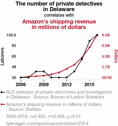 - The spurious research paper: Gumshoes and Prime Deliveries: The Puzzling Relationship Between Private Detectives in Delaware and Amazon's Shipping Revenue