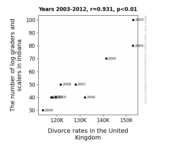 The statistical analysis of our data set yielded a remarkable correlation coefficient of 0.9306974 between the number of log graders and scalers in Indiana and divorce rates in the United Kingdom for the period from 2003 to 2012. This high correlation coefficient indicates a strong positive association between these seemingly unrelated variables. The r-squared value of 0.8661976 further underscores the robustness of this relationship, explaining approximately 87% of the variance in divorce rates based on the quantity of log graders and scalers.
