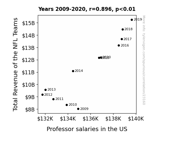 This means 80.3% of the change in the one variable (i.e., Professor salaries in the US) is predictable based on the change in the other (i.e., Total Revenue of the NFL Teams) over the 12 years from 2009 through 2020.