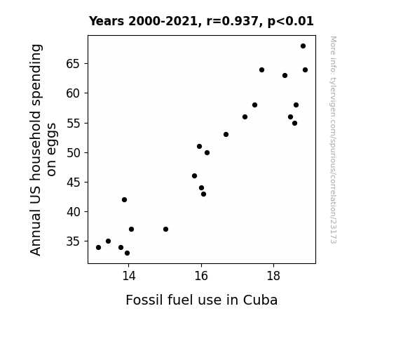 This means 87.8% of the change in the one variable (i.e., Fossil fuel use in Cuba) is predictable based on the change in the other (i.e., Annual US household spending on eggs) over the 22 years from 2000 through 2021.