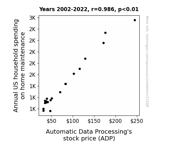 This means 97.2% of the change in the one variable (i.e., Automatic Data Processing's stock price (ADP)) is predictable based on the change in the other (i.e., Annual US household spending on home maintenance) over the 21 years from 2002 through 2022.