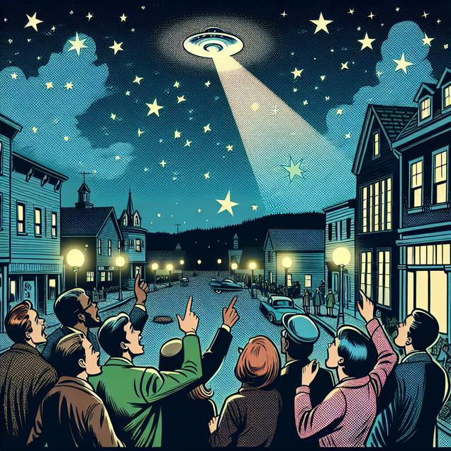 ChatGPT: Prompt: Generate a comic-book-style illustration with muted colors and a dotted halftone pattern from the 1960s depicting a small town in Maine. A group of people gather excitedly on a clear night, pointing up at the sky. Among them is a smiling young girl named Kenzie, her popular name echoing in the chatter around her. In the night sky, a glowing, mysterious object hovers, sparking whispers of UFO sightings. The town should exude a vintage feel with classic architecture and subtle street lighting. The illustration should capture the sense of wonder and anticipation in the crowd, emphasizing Kenzie's expression of wide-eyed excitement.