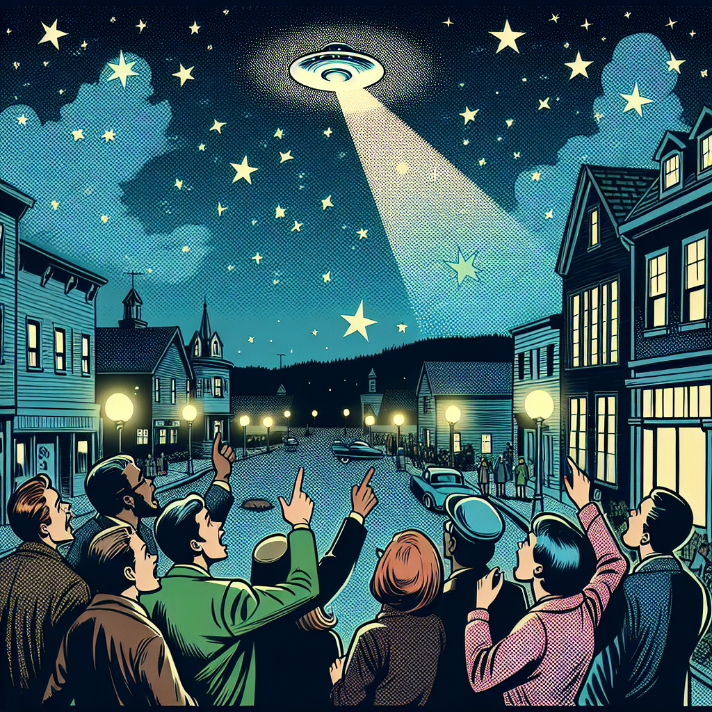 Prompt: Prompt: Generate a comic-book-style illustration with muted colors and a dotted halftone pattern from the 1960s depicting a small town in Maine. A group of people gather excitedly on a clear night, pointing up at the sky. Among them is a smiling young girl named Kenzie, her popular name echoing in the chatter around her. In the night sky, a glowing, mysterious object hovers, sparking whispers of UFO sightings. The town should exude a vintage feel with classic architecture and subtle street lighting. The illustration should capture the sense of wonder and anticipation in the crowd, emphasizing Kenzie's expression of wide-eyed excitement. The depiction should include only scenes, people, and objects, it should not include text or speech bubbles.