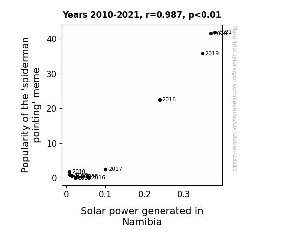 This means 97.4% of the change in the one variable (i.e., Solar power generated in Namibia) is predictable based on the change in the other (i.e., Popularity of the 'spiderman pointing' meme) over the 12 years from 2010 through 2021.