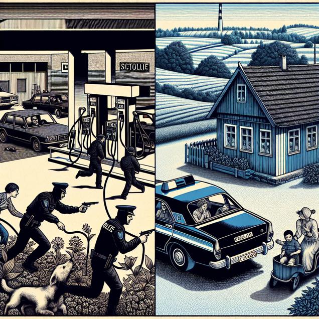 Prompt: Generated Image Prompt: Create an image in the style of a black-and-white newspaper illustration depicting a chaotic scene outside a gas station in a bustling Nevada city. Two robbers are seen fleeing the scene in a stolen car, with police cars in hot pursuit. Across the scene, contrast the chaotic city with a serene countryside in Latvia, where a family is peacefully pumping gasoline into their car at a picturesque roadside station. The two contrasting scenes should be connected, highlighting the stark difference between the bustling urban environment and the calm countryside. The depiction should include only scenes, people, and objects, it should not include text or speech bubbles.