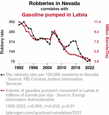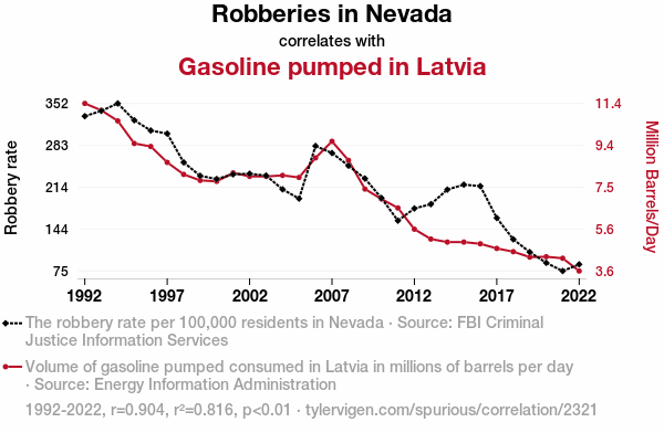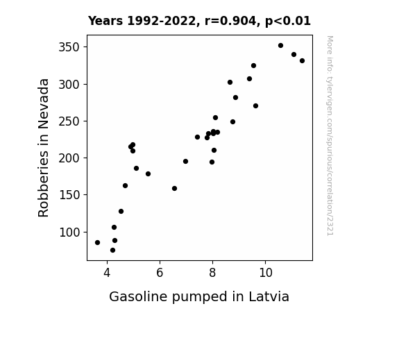 - The spurious research paper: Roguish Robberies and Ridiculous Refueling: Revisiting the Relationship between Robberies in Nevada and Gasoline Pumped in Latvia
