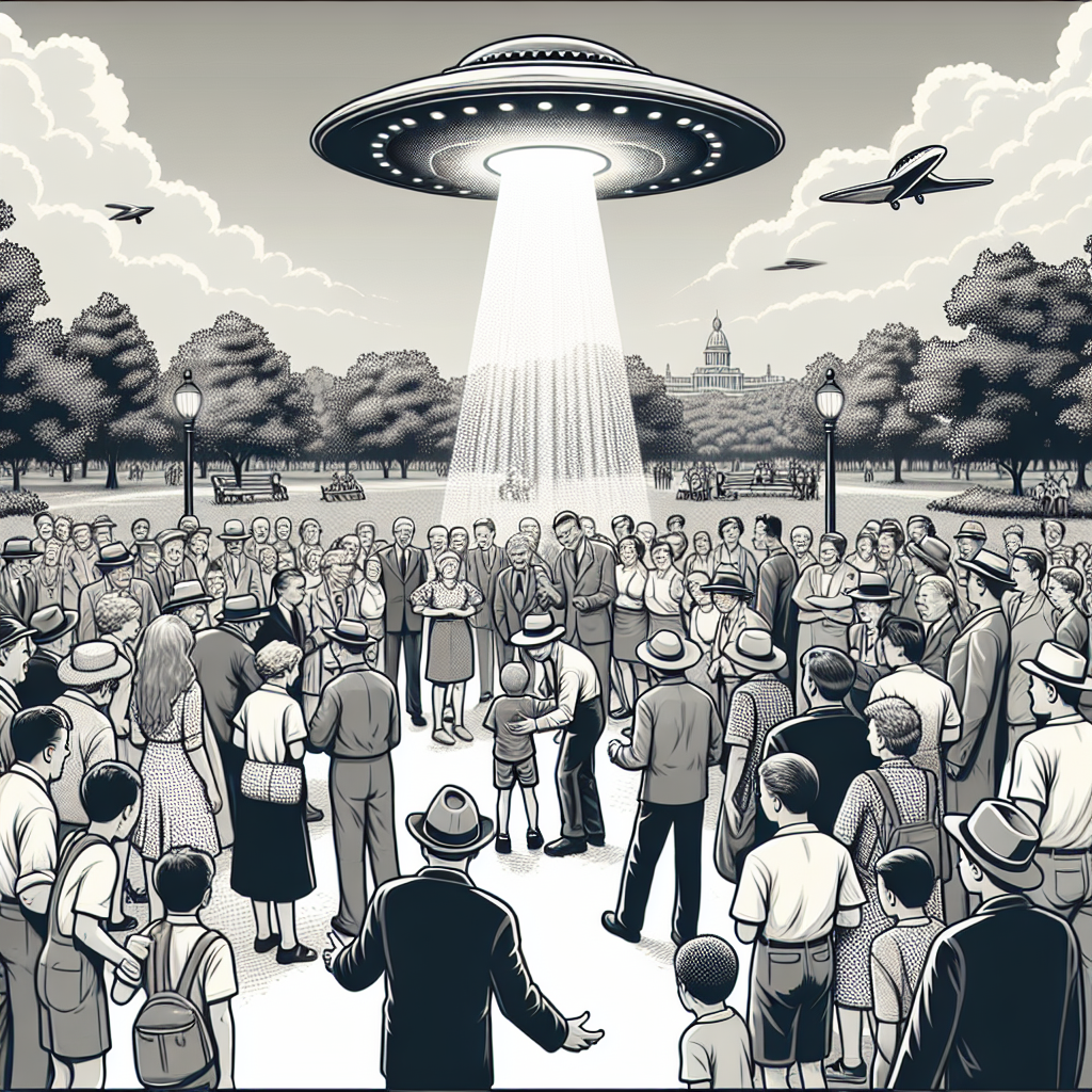 Prompt: Generate a black-and-white newspaper illustration of a crowded park in Michigan, with a group of people gathered around a young boy named Mason in the center. Mason is surrounded by eager fans, asking for his autograph. In the sky above them, a glowing UFO hovers, capturing the attention of everyone in the park. The scene should be depicted in a simple and clear visual style typical of a classic newspaper illustration. The depiction should include only scenes, people, and objects, it should not include text or speech bubbles.