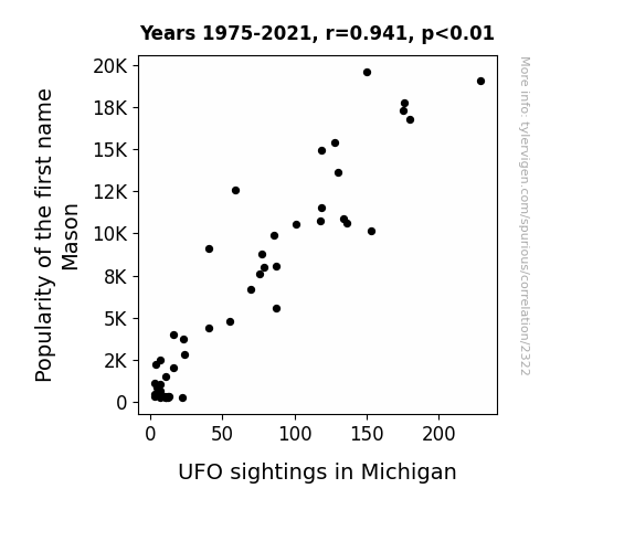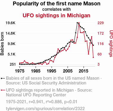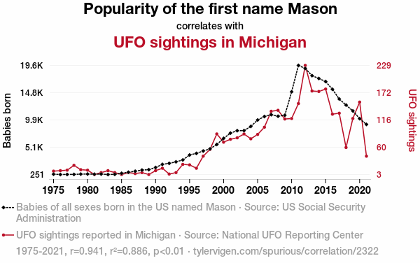 User prompt: Please provide potential search keywords for a paper titled Masonry in the Sky: The Interstellar Influence on Mason Name Popularity and UFO Sightings in Michigan with an abstract of Our research delves into the peculiar correlation between the popularity of the first name "Mason" and the frequency of UFO sightings in the state of Michigan. Utilizing data from the US Social Security Administration and the National UFO Reporting Center, we conducted a comprehensive statistical analysis covering the years 1975 to 2021. Our findings reveal a striking correlation coefficient of 0.9414064 and a statistically significant p-value of less than 0.01.