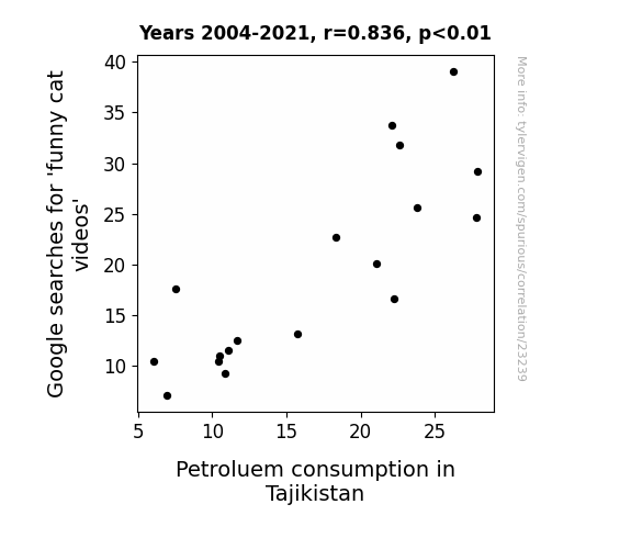 This means 69.9% of the change in the one variable (i.e., Petroluem consumption in Tajikistan) is predictable based on the change in the other (i.e., Google searches for 'funny cat videos') over the 18 years from 2004 through 2021.