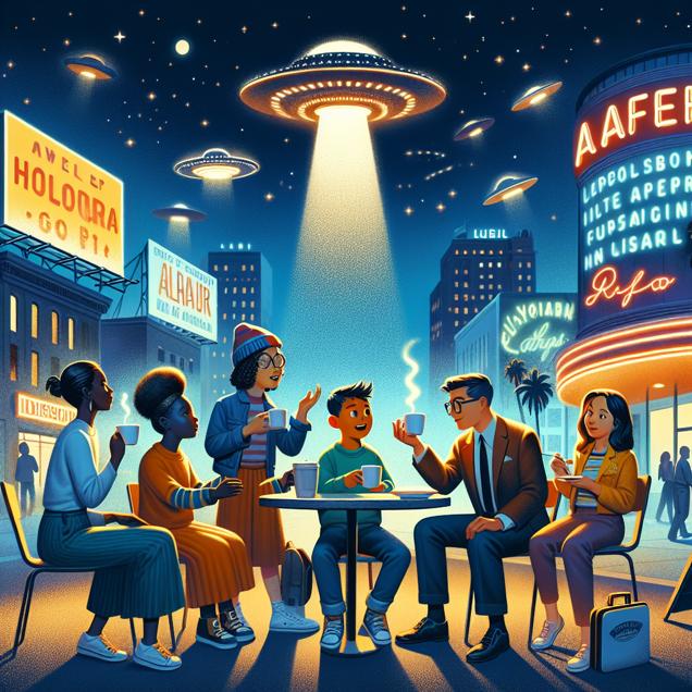 User prompt: Please respond with an image generation prompt that would be likely to create an interesting visual using DALLE-3, using the following style: [ Whimsical illustration ] and depicting this scene: In a bustling California city, a group of people excitedly discuss UFO sightings while sipping coffee at a popular café. A boy named Jackson leads the conversation, capturing the attention of everyone with his enthusiasm for the topic. Nearby, a brightly lit billboard proudly displays the name "Jackson" as one of the most popular first names in the state. Above them, a mysterious object hovers in the night sky, leaving the onlookers in awe as they continue to talk about the unexplained phenomena. Keep the visual depiction simple. Do not include any words or speech bubbles.