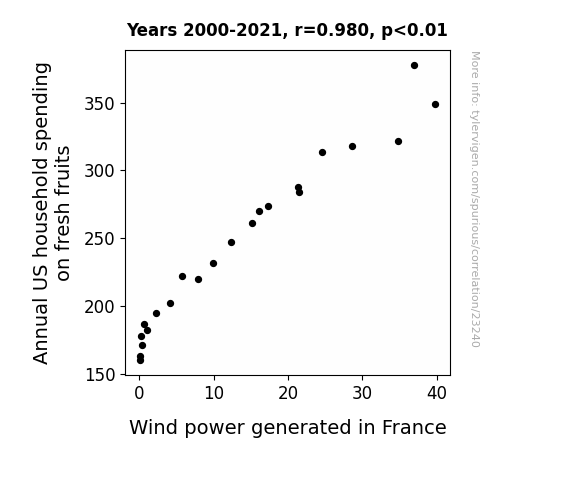 This means 96.1% of the change in the one variable (i.e., Wind power generated in France) is predictable based on the change in the other (i.e., Annual US household spending on fresh fruits) over the 22 years from 2000 through 2021.