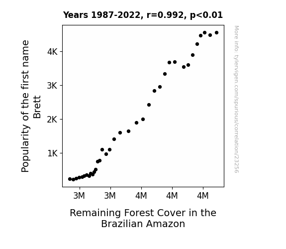 This means 98.4% of the change in the one variable (i.e., Remaining Forest Cover in the Brazilian Amazon) is predictable based on the change in the other (i.e., Popularity of the first name Brett) over the 36 years from 1987 through 2022.