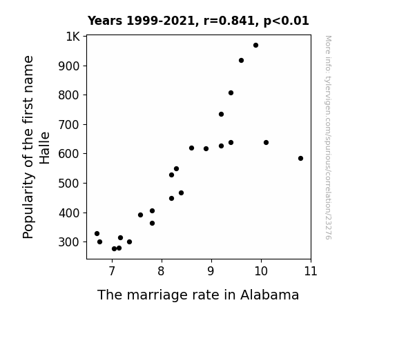 This means 70.8% of the change in the one variable (i.e., The marriage rate in Alabama) is predictable based on the change in the other (i.e., Popularity of the first name Halle) over the 23 years from 1999 through 2021.