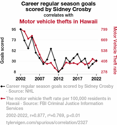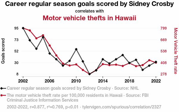 This means 76.9% of the change in the one variable (i.e., Motor vehicle thefts in Hawaii) is predictable based on the change in the other (i.e., Career regular season goals scored by Sidney Crosby) over the 21 years from 2002 through 2022.