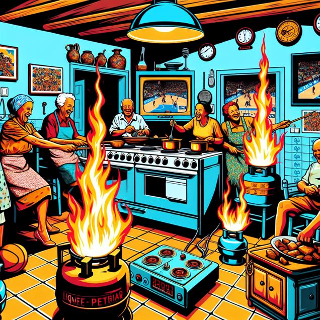ChatGPT: Prompt: Create a vibrant pop art-inspired image of a cozy Portuguese kitchen, with a family gathered around a stove cooking a traditional meal. The stove should be the central focus, with flames leaping from the burners. The family should be engaged in cooking, cheering for the Boston Celtics game playing on the TV in the background. The colors should be bold and dynamic, with exaggerated contrasts to evoke the energetic atmosphere. The meter above the stove tracking Liquefied Petroleum Gas usage should stand out and convey a sense of motion. The Celtics' season loss count on the TV should be prominent, contributing to the overall lively and expressive pop art style.