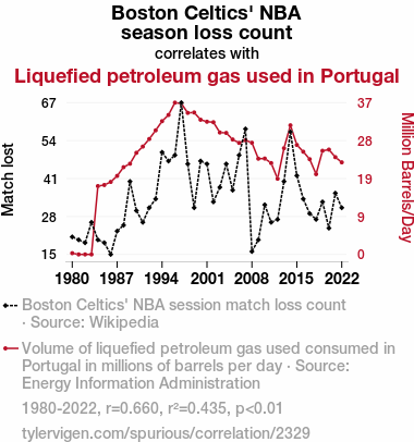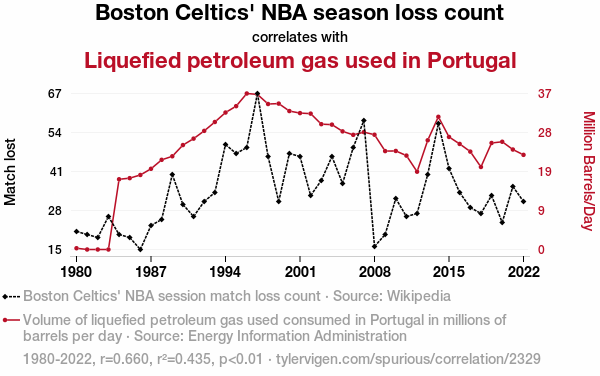 A linear line chart with years as the X-axis and two variables on the Y-axis. The first variable is Boston Celtics' NBA season loss count and the second variable is Liquefied petroleum gas used in Portugal.  The chart goes from 1980 to 2022, and the two variables track closely in value over that time. Small Image