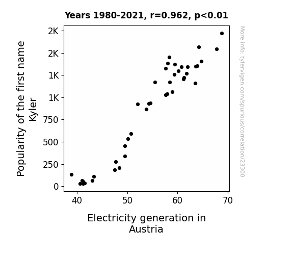 This means 92.5% of the change in the one variable (i.e., Electricity generation in Austria) is predictable based on the change in the other (i.e., Popularity of the first name Kyler) over the 42 years from 1980 through 2021.
