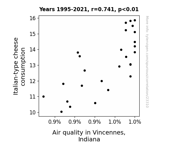This means 55% of the change in the one variable (i.e., Air quality in Vincennes, Indiana) is predictable based on the change in the other (i.e., Italian-type cheese consumption) over the 27 years from 1995 through 2021.