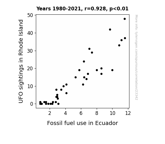 This means 86.1% of the change in the one variable (i.e., Fossil fuel use in Ecuador) is predictable based on the change in the other (i.e., UFO sightings in Rhode Island) over the 42 years from 1980 through 2021.