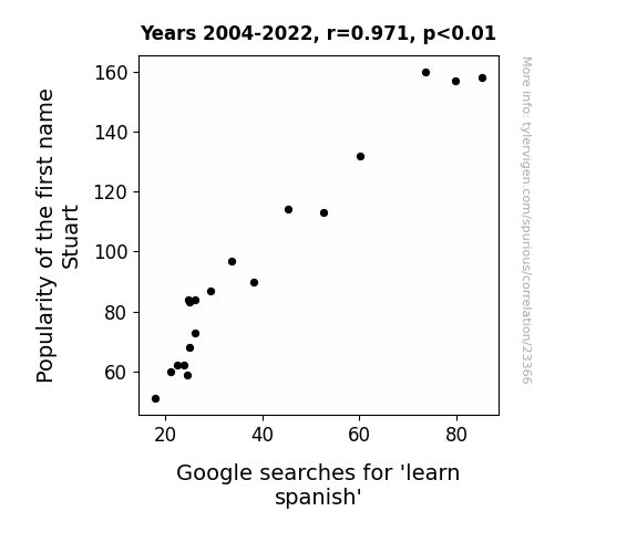 This means 94.2% of the change in the one variable (i.e., Google searches for 'learn spanish') is predictable based on the change in the other (i.e., Popularity of the first name Stuart) over the 19 years from 2004 through 2022.