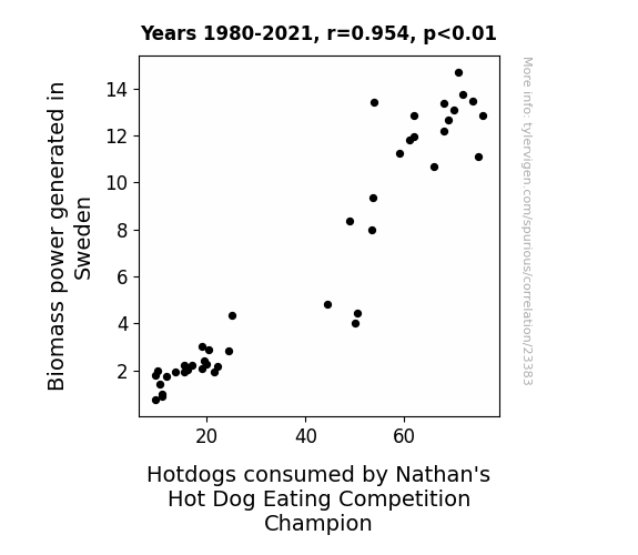 This means 91% of the change in the one variable (i.e., Hotdogs consumed by Nathan's Hot Dog Eating Competition Champion) is predictable based on the change in the other (i.e., Biomass power generated in Sweden) over the 42 years from 1980 through 2021.