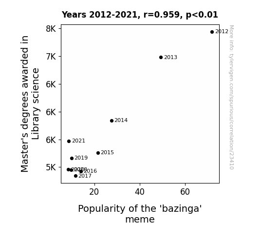 This means 92% of the change in the one variable (i.e., Popularity of the 'bazinga' meme) is predictable based on the change in the other (i.e., Master's degrees awarded in Library science) over the 10 years from 2012 through 2021.
