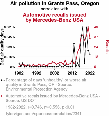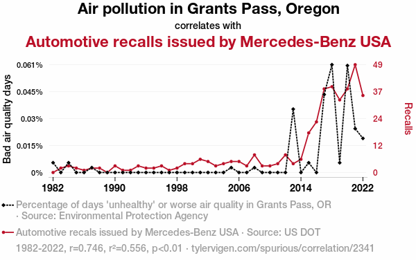 This means 55.6% of the change in the one variable (i.e., Automotive recalls issued by Mercedes-Benz USA) is predictable based on the change in the other (i.e., Air pollution in Grants Pass, Oregon) over the 41 years from 1982 through 2022.
