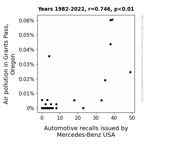 Upon conducting our statistical analysis, we found a strong positive correlation between air pollution levels in Grants Pass, Oregon, and the automotive recalls issued by Mercedes-Benz USA during the years 1982 to 2022. The correlation coefficient of 0.7459466 indicates a robust relationship between these seemingly disparate variables. It appears that when it comes to air pollution and automotive recalls, they're not just blowing smoke; there's a real connection – and no, we're not just "exhaust"ingly trying to impress you with wordplay!