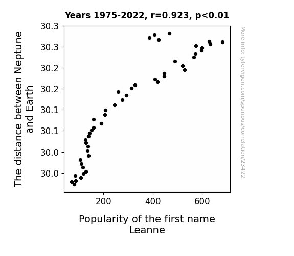 This means 85.1% of the change in the one variable (i.e., Popularity of the first name Leanne) is predictable based on the change in the other (i.e., The distance between Neptune and Earth) over the 48 years from 1975 through 2022.