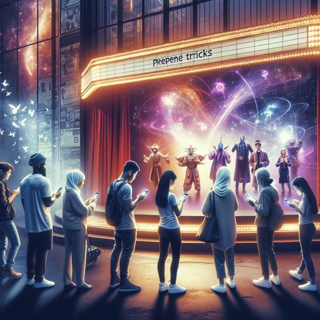 User prompt: Please respond with an image generation prompt that would be likely to create an interesting visual using DALLE-3, using the following style: [ Futuristic ] and depicting this scene: In a theater in Minnesota, the number of actors varies throughout the day. As the cast swells and recedes, the energy of make-believe ebbs and flows in the air. Outside the theater, a group of people can be seen huddled around a phone, eagerly searching "how to do magic" on Google. The collective belief in the power of make-believe infuses the cosmic energy, causing the expressions of curiosity and magical motivation to flicker and waver in synchronization with the changing number of actors on stage. Keep the visual depiction simple. Do not include any words or speech bubbles.