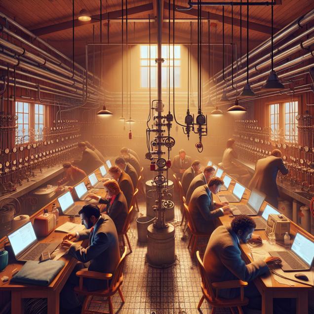 Prompt: Generate an image of a cozy Vermont hotel's maintenance room, where a group of hotel managers are frantically adjusting valves to balance water pressure in the showers. Meanwhile, in dimly lit guest rooms, guests are huddled around their laptops, researching "practical engineering tips for shower pressure" online. The warm glow of the screens illuminates the determined expressions of the guests as they seek solutions, while the hotel managers work against the backdrop of pipes and machinery. Capture the sense of quiet urgency and the contrast between the technical huddle of the managers and the determined solitude of the guests, all set within the cozy, rustic atmosphere of the hotel. The depiction should include only scenes, people, and objects, it should not include text or speech bubbles.