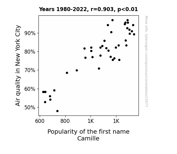 This means 81.5% of the change in the one variable (i.e., Popularity of the first name Camille) is predictable based on the change in the other (i.e., Air quality in New York City) over the 43 years from 1980 through 2022.
