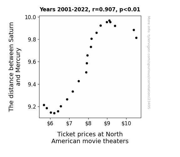 This means 82.3% of the change in the one variable (i.e., Ticket prices at North American movie theaters) is predictable based on the change in the other (i.e., The distance between Saturn and Mercury) over the 22 years from 2001 through 2022.