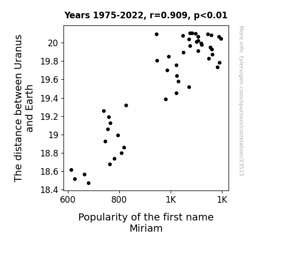 This means 82.6% of the change in the one variable (i.e., Popularity of the first name Miriam) is predictable based on the change in the other (i.e., The distance between Uranus and Earth) over the 48 years from 1975 through 2022.