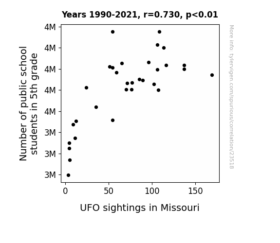 This means 53.3% of the change in the one variable (i.e., UFO sightings in Missouri) is predictable based on the change in the other (i.e., Number of public school students in 5th grade) over the 32 years from 1990 through 2021.