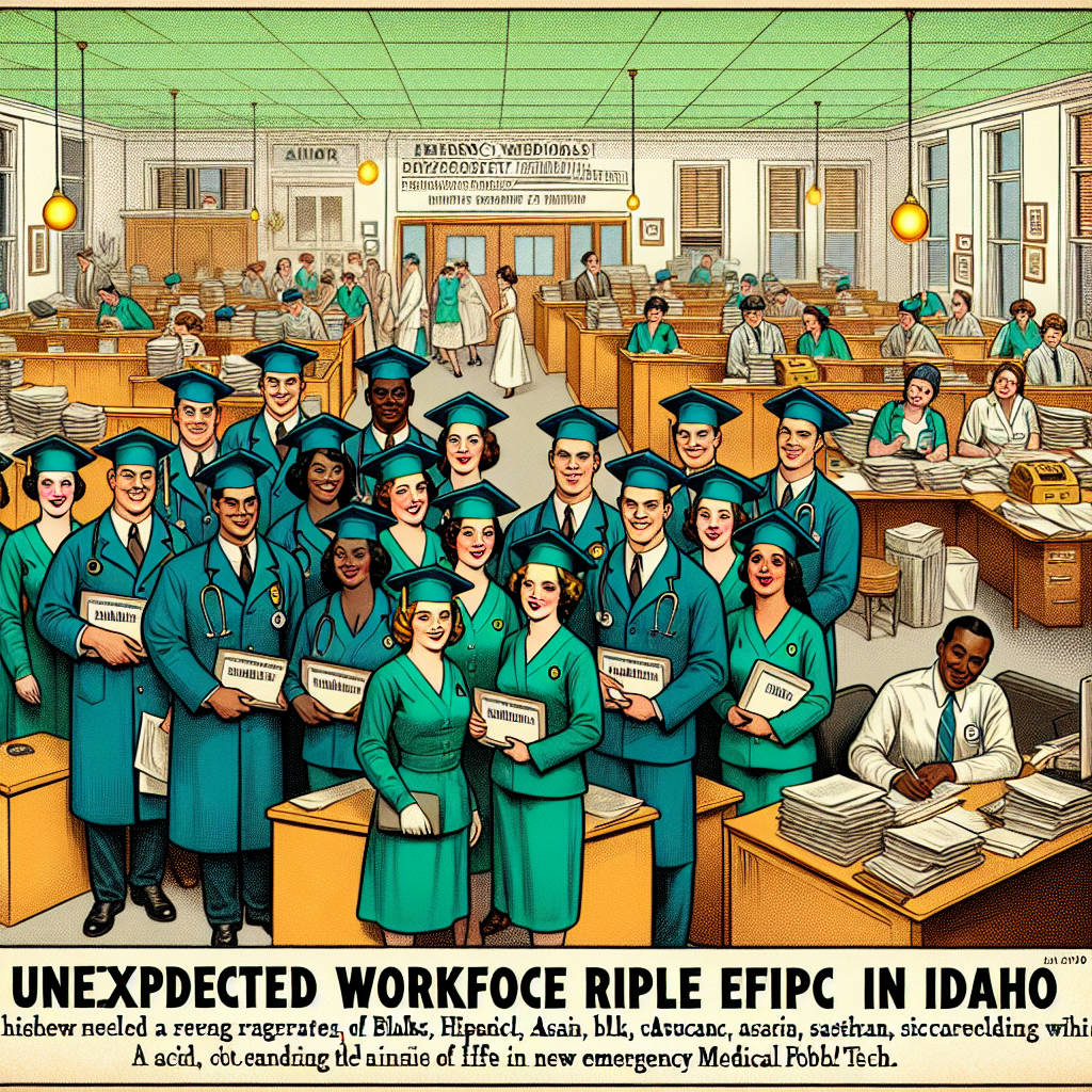 ChatGPT: In a bustling Idaho hospital, a group of EMT graduates proudly clutch their Associates degrees in Emergency Medical Tech, their freshly-ironed uniforms and determined expressions signaling their readiness to save lives. In the background, a team of secretaries, their desks cluttered with paperwork, busily juggle phone calls and files, their number having grown to accommodate the recent influx of medical professionals. The unlikely connection between the increased EMT graduates and the bustling secretarial team highlights the unexpected workforce ripple effect, leaving no doubt that even the most unexpected correlations can lead to significant shifts in the employment landscape.