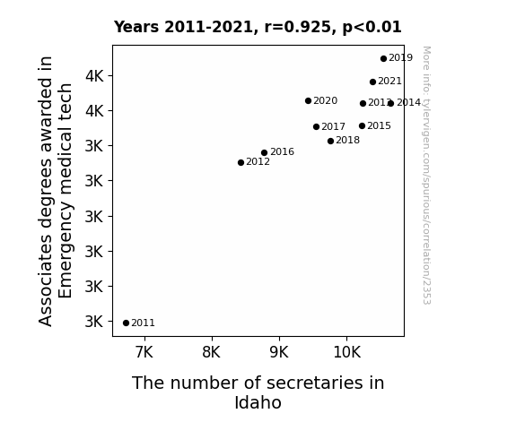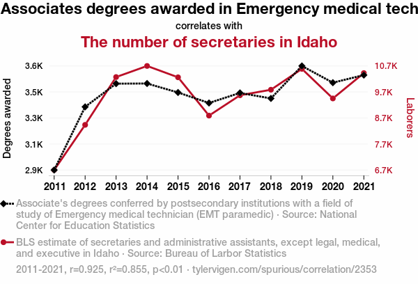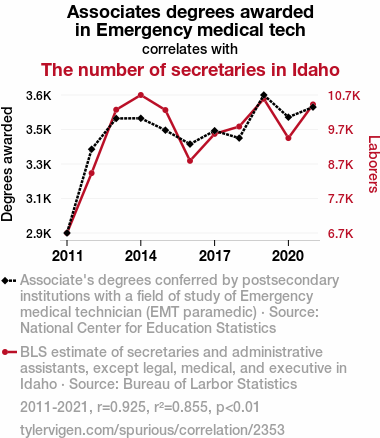 User prompt: Please provide potential search keywords for a paper titled Associates in Ambulance: Uncovering the Unexpected Link Between Emergency Medical Tech Degrees and Secretaries in Idaho with an abstract of In this paper, we embark on a humorous journey through the strange and unexpected correlation between the awarding of Associate degrees in Emergency Medical Technology and the number of secretaries in the scenic state of Idaho. Our research team, with a penchant for serendipitous discoveries and a touch of whimsy, utilized data from the National Center for Education Statistics and the Bureau of Labor Statistics to unravel this enigmatic relationship. Our findings, much to our delight, revealed a remarkably robust correlation coefficient of 0.9248796 with a p-value of less than 0.01 for the years 2011 to 2021.