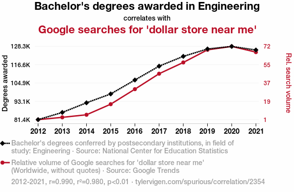 - The spurious research paper: Engineering Enrollment and Economic Endeavors: Exploring the Enigmatic Link between Bachelor's Degrees and Dollar Store Searches