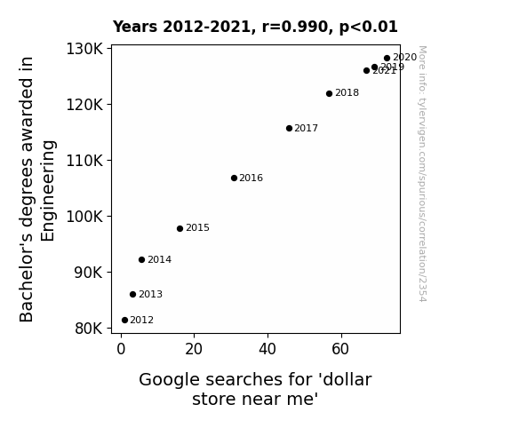 This means 98% of the change in the one variable (i.e., Google searches for 'dollar store near me') is predictable based on the change in the other (i.e., Bachelor's degrees awarded in Engineering) over the 10 years from 2012 through 2021.