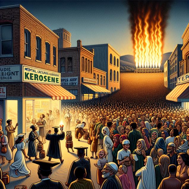 ChatGPT: Generate an image that resembles a scene from a Disney movie, portraying a bustling street in Kazakhstan with people lining up to buy kerosene. Additionally, depict a packed auditorium filled with excitement as graduates proudly receive their Associate degrees in Visual and Performing Arts. In the background, include avant-garde fire-breathing performances illuminating the night sky, highlighting the growing demand for this dynamic art form. The image should showcase the vibrant energy and diverse activities in the bustling city streets.