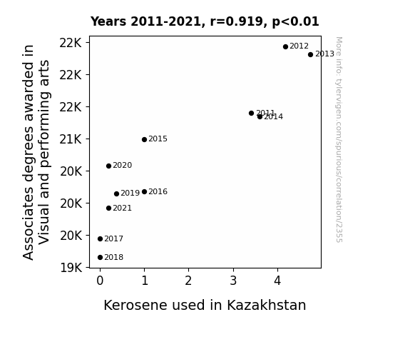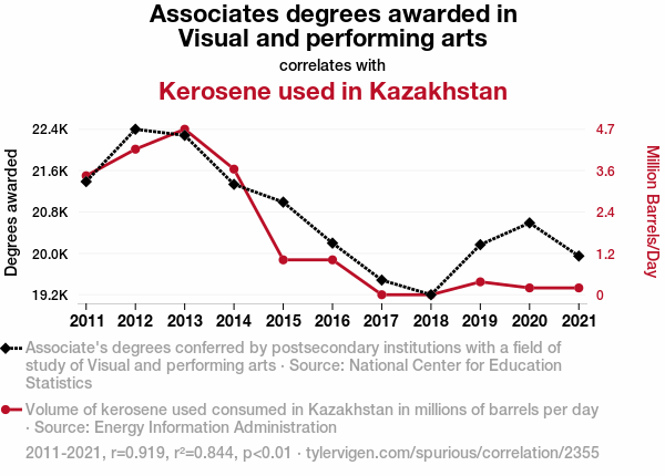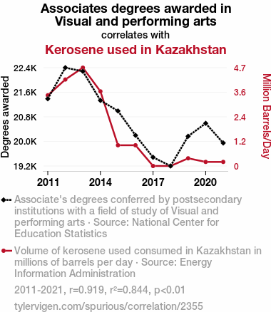 - The spurious research paper: From Kerosene to Canvas: Unveiling the Unlikely Link Between Associates Degrees in Visual and Performing Arts and Kerosene Consumption in Kazakhstan