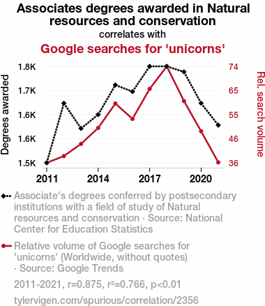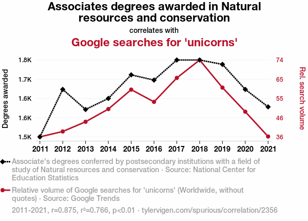- The spurious research paper: The Ripple Effect: Associates Degrees in Natural Resources and Conservation and Google Searches for 'Unicorns'