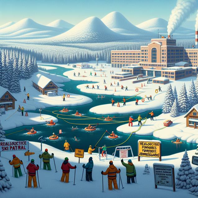 Prompt: Create an image of a wintery scene in Vermont, showcasing a stunning snowy landscape. The foreground features a serene lake and ski slopes, with chaotic scenes of insufficient lifeguards and ski patrol leading to increased emergency room visits. In the background, a hospital is allocating more funds to handle the influx of patients, resulting in decreased funds for administrative roles. Additionally, depict a downward trend in the salaries of assistant professors across the US. The visual should capture these scenes in a simple yet impactful manner. The depiction should include only scenes, people, and objects, it should not include text or speech bubbles.