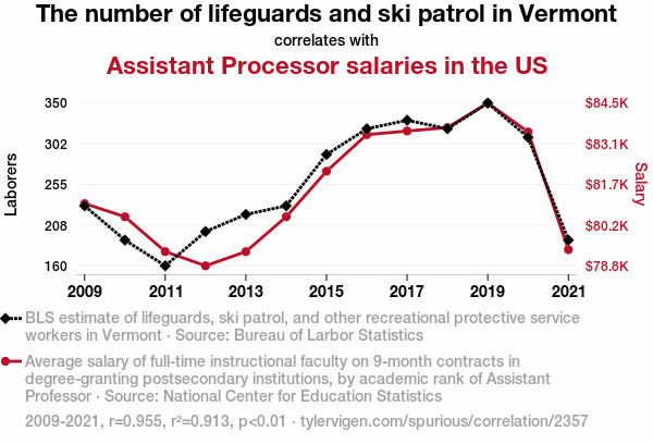 This means 91.3% of the change in the one variable (i.e., Assistant Processor salaries in the US) is predictable based on the change in the other (i.e., The number of lifeguards and ski patrol in Vermont) over the 13 years from 2009 through 2021.