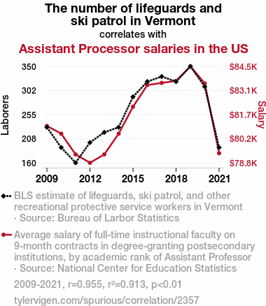 Our findings, with a p-value of less than 0.01 for the years 2009 to 2021, suggest that there is more to this connection than meets the eye. One might say that this research truly breaks the ice on a chilly mystery that has baffled many. After all, who would have thought that the number of lifeguards and ski patrol in Vermont could have an impact on the compensation of assistant professors nationwide? It seems that when it comes to statistical surprises, this study has certainly taken the plunge.